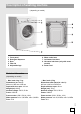 Description of washing machine (depending on model) 1. 2. 3. 4. 5. Front panel Detergent dispenser Door Filter lid Adjustable legs 6. Water outlet hose 7. Cold water inlet hose 8. Hot water inlet hose (only with some models) 9. Power cord Technical information (depending on model) • Max.