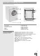Description of washing machine Technical information (depending on model) 5. Adjustable legs 6. Water outlet hose 7. Water inlet hose 8. Mains power cable Dimensions (w x d x h): 600 mm x 600 mm x 850 mm Dimensions (w x d x h): 600 mm x 440 mm x 850 mm Depth with door open: 106 cm / 88 cm (depending on model) Weight (net): 90 kg / 76 kg (depending on model) Nominal voltage: 230 V, 50 Hz Power: 2300 W / 2000 W (depending on model) Max.