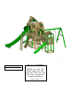 STEP 33: ATTACHING THE ROCK WALL 1: PLACE THE ROCK WALL INTO POSITION CENTERED ON THE LEFT SIDE OF THE MAIN LEVEL FORT AS SHOWN BELOW. THE GREEN BRACKETS SHOULD BE 2-1/4" ABOVE THE BOTTOM OF THE BOTTOM PANEL BOARD. USING THE 90 GREEN BRACKETS AS A TEMPLATE; DRILL A 3/8” HOLE THROUGH THE BOTTOM PANEL BOARD. 2: GO UNDERNEATH THE DECK TO INSERT A T-NUT INTO THE BACKSIDE OF THE 3/8” HOLES IN THE BOTTOM PANEL BOARD. 3: ATTACH THE ROCK WALL WITH 5/16 X 1-1/2” BOLTS AND 5/16” WASHERS.