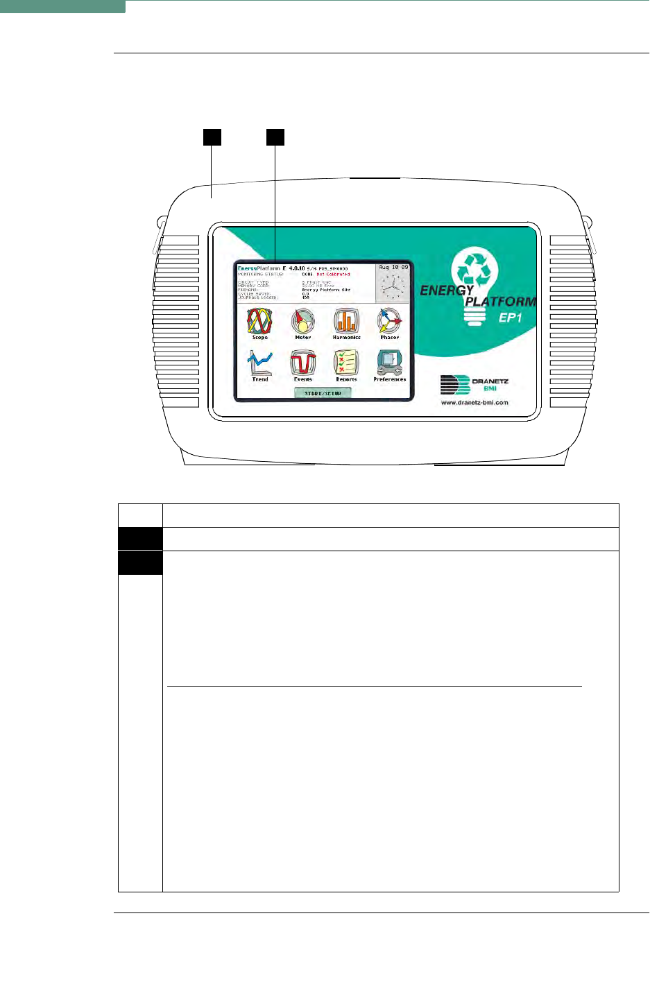 The front view primarily shows the color touch screen LCD. See below for descriptions