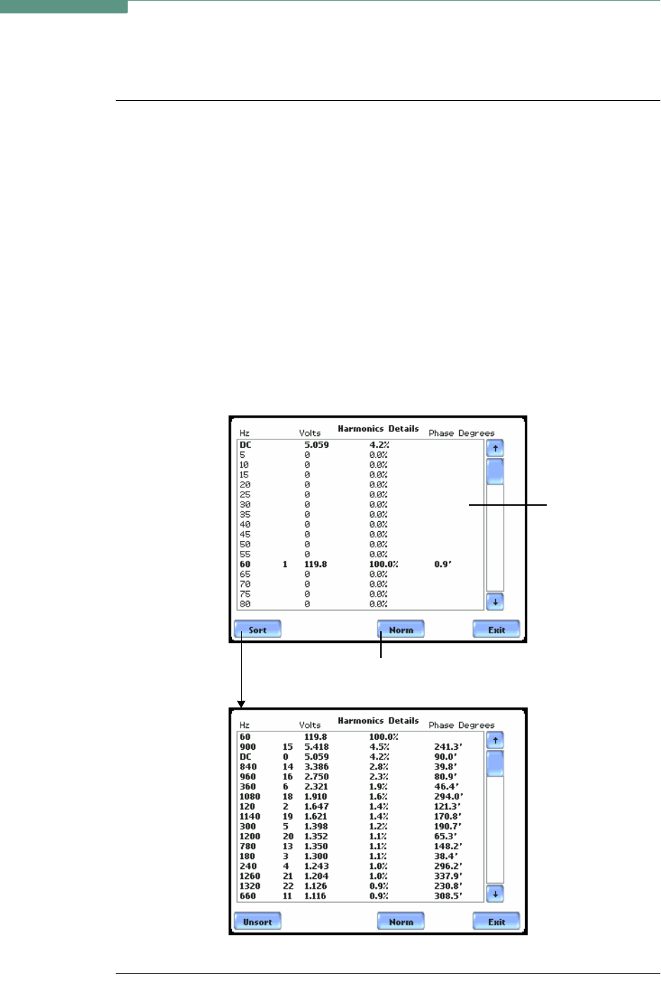 of 5Hz. Use the Sort button to organize harmonic text display according to percent