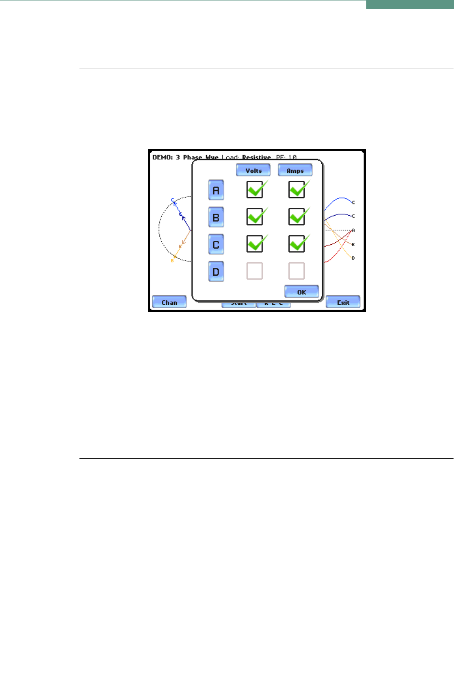 The Parameter/Channel selection screen is displayed by pressing Chan on the phasor