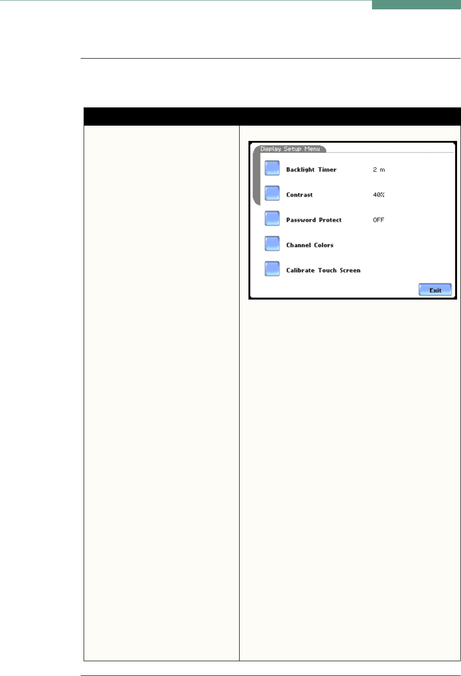 password protect, parameter/channel colors, and touch screen calibration.