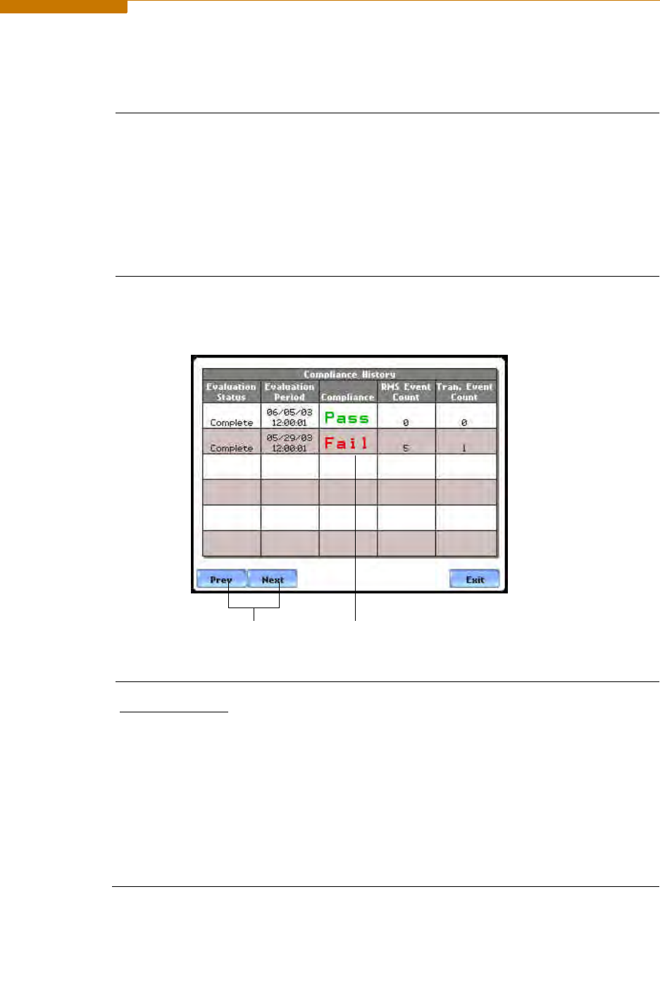 the EN50160 screen on page 8-3, press History. The Compliance History table will