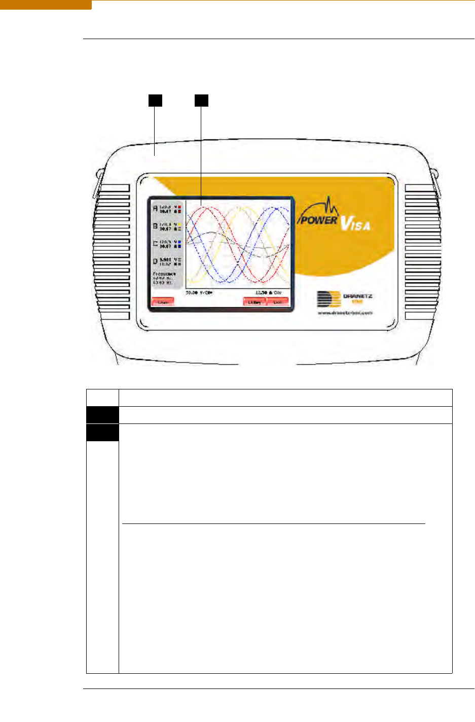 The front view primarily shows the color touch screen LCD. See below for descriptions