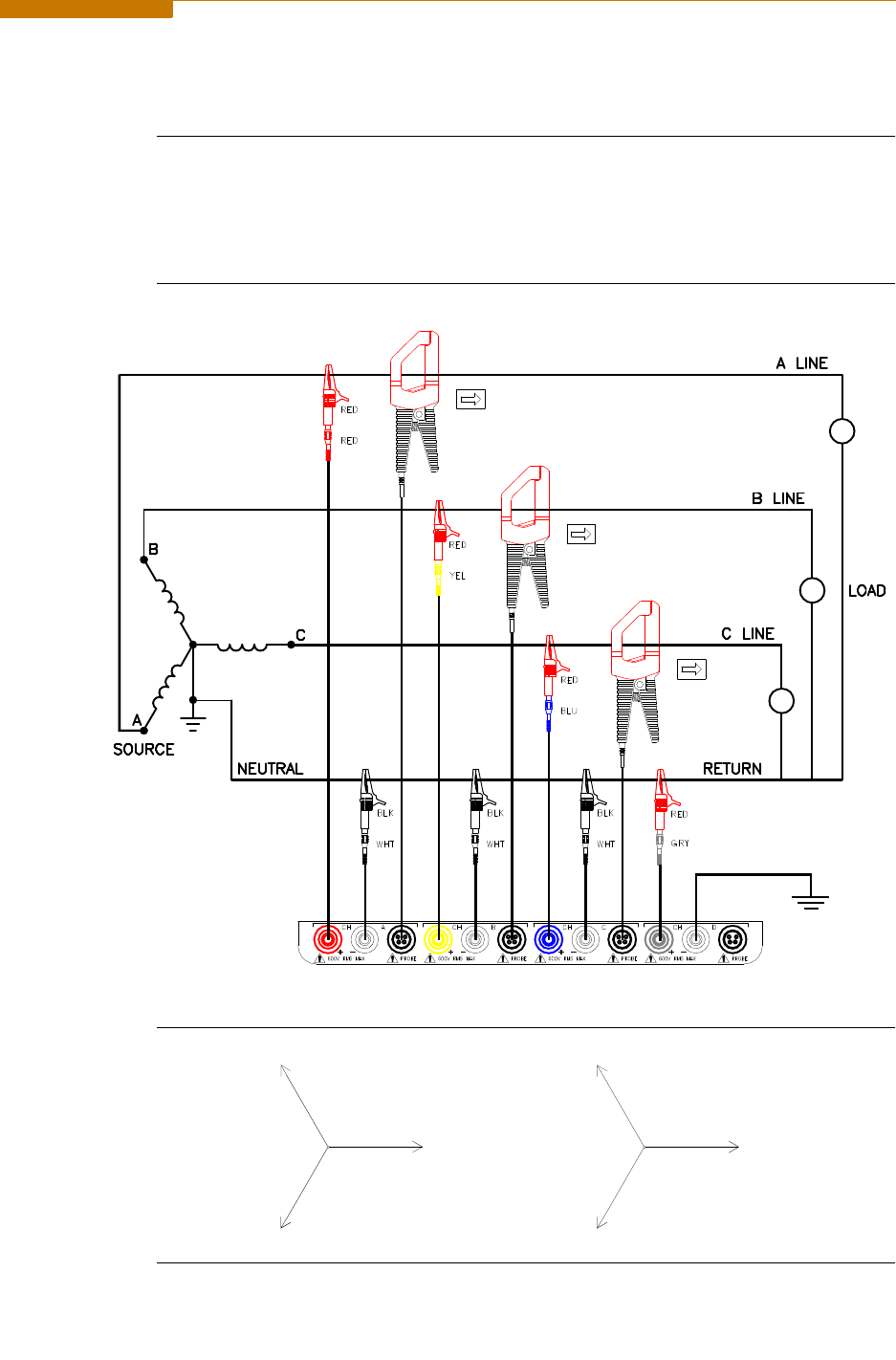 Channels A, B, and C are connected to voltage and current probes. The neutral is