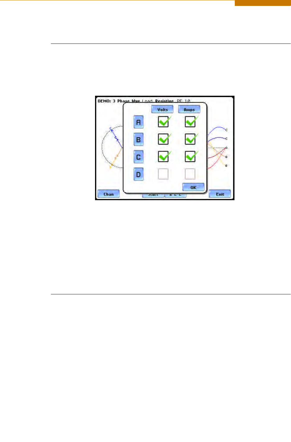 The Parameter/Channel selection screen is displayed by pressing Chan on the phasor