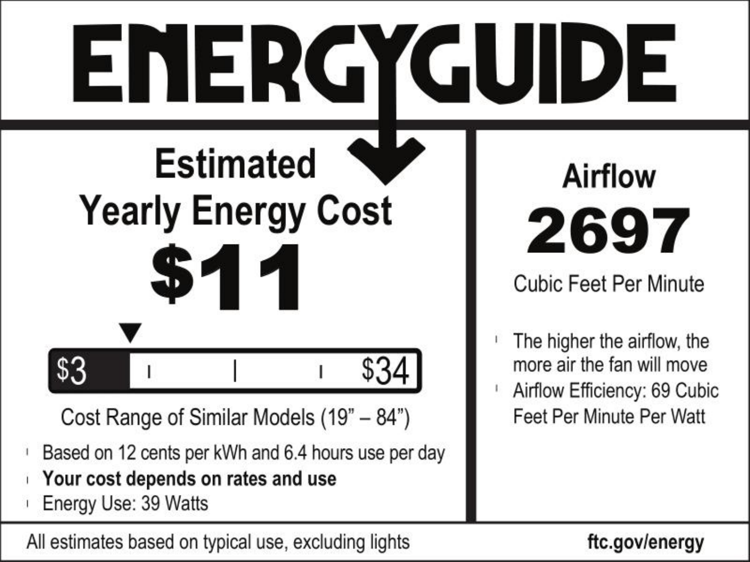 ENERGY GUIDE Estimated Airflow Yearly Energy Cost 2697 s 1 1 Cubic Fest Per Minute v L The higher the airflow, the % more air the fan will move Cost Range of Similar Models (19" 84") Feet Per Minute Per Watt + Based on 12 cents per kWh and 8.