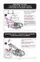 Attaching seat pad • Installation du coussin de siège • Instalación de la almohadilla del asiento 13 Wrap the top of the seat pad over backrest. Position opening over recline button. Recouvrir le dossier du sommet du coussin de siège. Installer l’ouverture sur le bouton d’inclinaison. Envuelva la parte de arriba de la almohadilla del asiento sobre el apoyaespalda. Ajuste la abertura sobre el botón de reclinación. 14 Pull both shoulder straps through slots in pad.