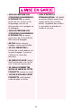 Atención y mantenimiento • La ALMOHADILLA REMOVIBLE PARA EL ASIENTO (si así está equipada) se puede lavar con agua fría en el ciclo delicado y secar al aire. NO USAR BLANQUEADOR. • PARA LIMPIAR EL ARMAZÓN DEL COCHECITO, use solamente jabón de uso doméstico y agua tibia. NO USE BLANQUEADOR ni detergente. • DE VEZ EN CUANDO, INSPECCIONE SU COCHECITO para determinar si hay tornillos flojos, piezas gastadas, material o puntos rotos. Cambie o repare las piezas según sea necesario.