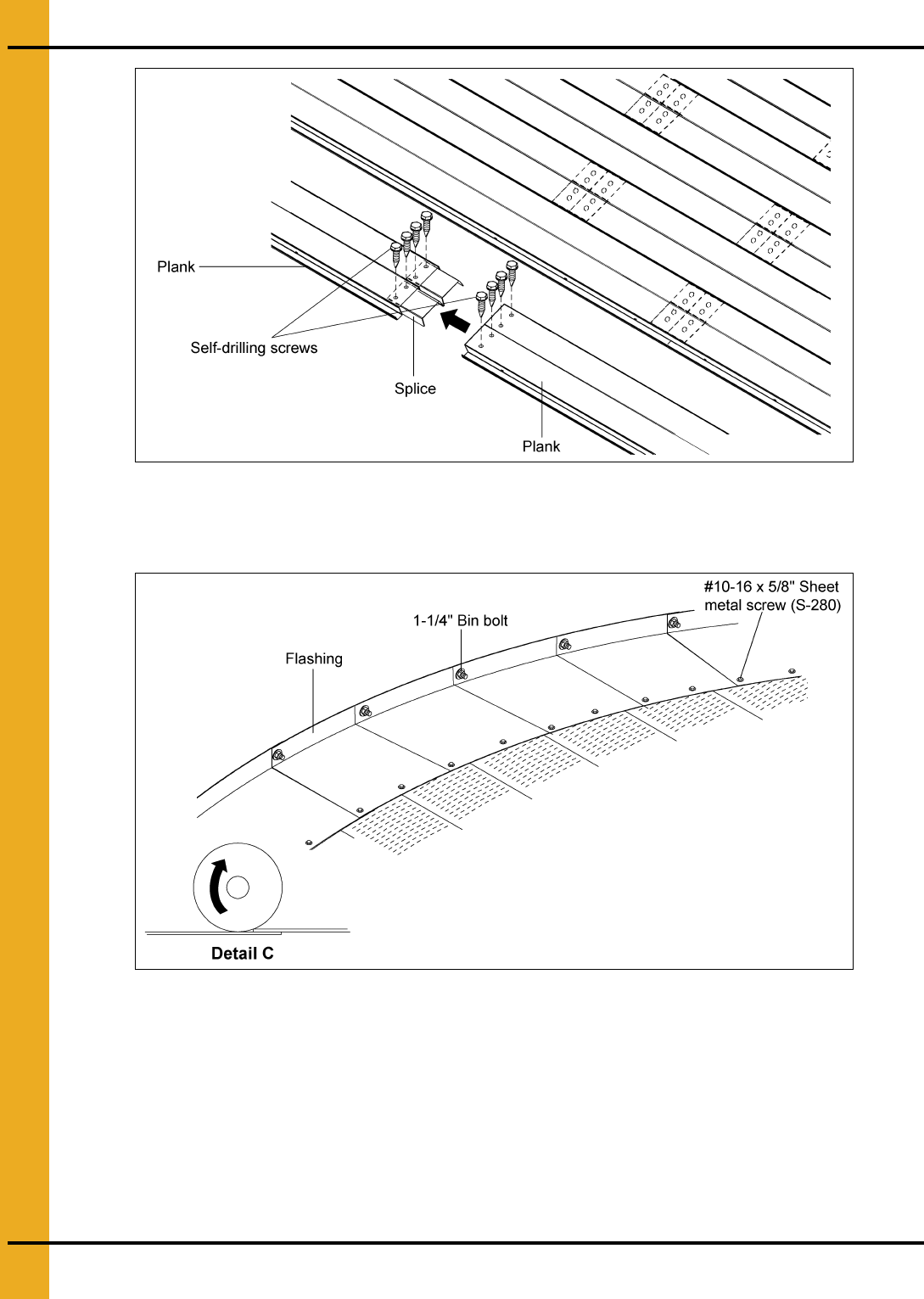 If bin sweep auger is to be used, overlap flashing such that rotation (usually clockwise) of the sweep will