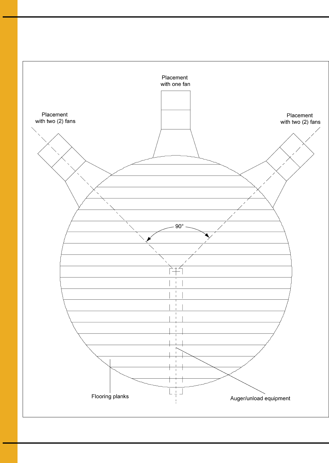 For uniform air flow, place the fans in relation to the unloading tube as shown in Figure 4A. Floor planks