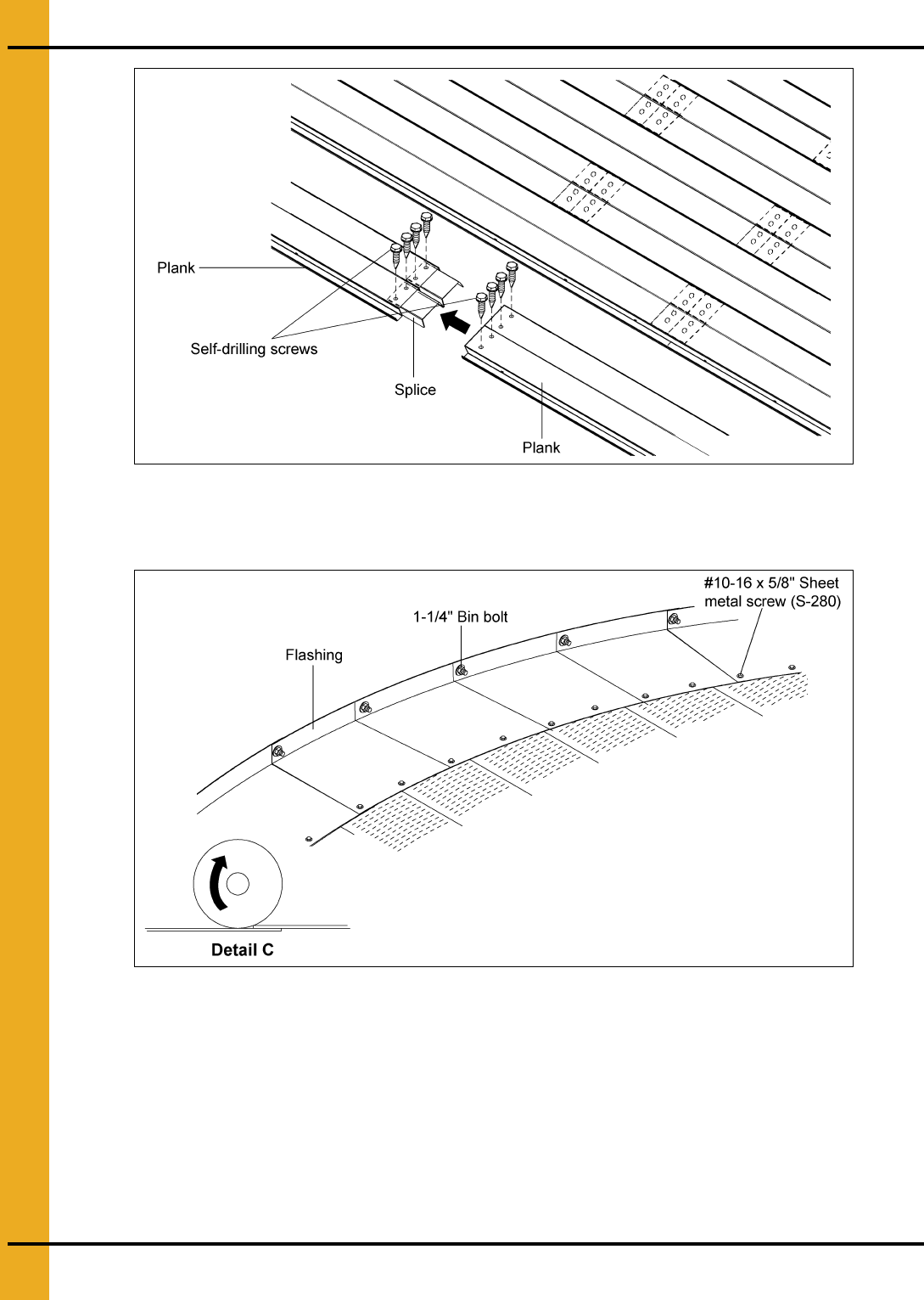If bin sweep auger is to be used, overlap flashing such that rotation (usually clockwise) of the sweep will