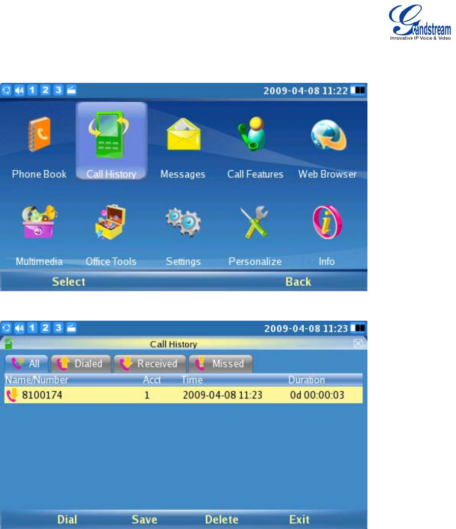 Press F1 to Select the Call History, and you will enter a screen similar to the one below: