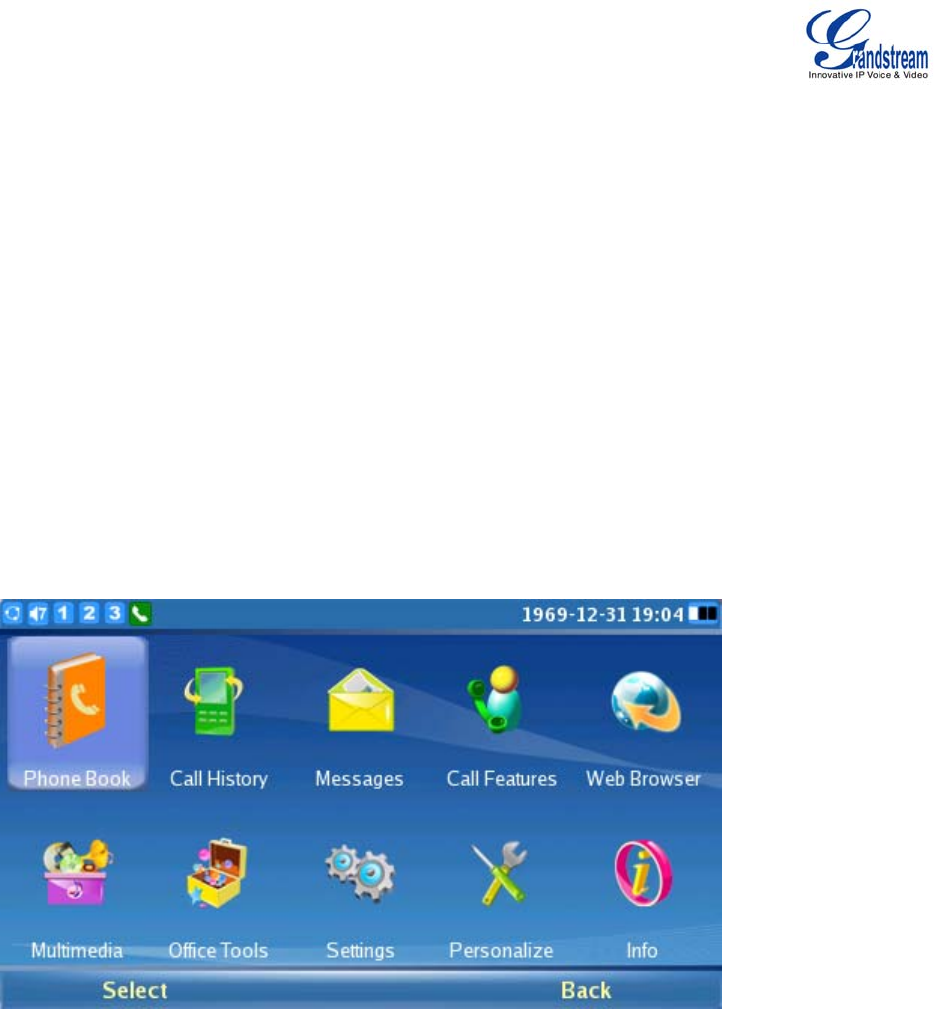 Step 2: Press “Select” (F1 or the OK button) to enter into the phone Settings menu and select Maintenance.