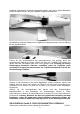 Die Abbildung zeigt das bereits aufgeklebte Höhenleitwerk und den Klebeauftrag für das Seitenleitwerk. Achtung: Für diese Klebevorgänge keinesfalls Aktivator verwenden, da sich sonst die Leitwerke möglicherweise nicht mehr komplett einschieben lassen. Zum Öffnen der Kabinenhaube diese, wie abgebildet, an der Hinterseite seitlich festhalten und nach oben abziehen. Die Schraube zur Fixierung der Höhenrudergestänge zuerst lösen, dann die beiden Gabelköpfe in die Höhenruderhörner einhängen.