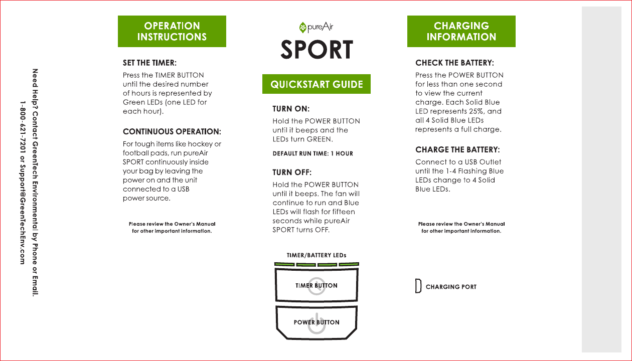 wWodAuIyIeusmngUoddNS 10 LDZL-LZY-008-L “IP 10 Buy Aq [DjUBWIUGIALG YSBJUSBID (IDO Oldish pee OPERATION INSTRUCTIONS SET THE TIMER: Press the TIMER BUTTON until the desired number of hours ls represented by Green LED {one LED for each hour). CONTINUOUS OPERATION: For tough items like hockey or football pads, run pure Air SPORT continuously Inside your bag by leaving the power an and the unit connected fo a USB power source. Finalist review tha Owner's Mon val for other important information.