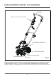FAMILIARÍCESE CON SU CULTIVADORA MANUBRIO SAFETY LOCK-OUT DEL BOTÓN PROTECTOR DE RASTRILLOS CONJUNTO DE RUEDAS CLAVIJA DE SUJECIÓN RASTRILLOS INTERIORES HITCH PIN Fig. 2 Antes de hacer funcionar su cultivador, lea este manual del operador y las reglas de seguridad. Compare el dibujo de la Fig. 2.1 con su cultivador para familiarizarse con la ubicación de los distintos controles y sistemas de ajuste. Guarde este manual para usarlo como referencia futura.