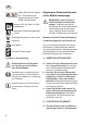 FR Tenez toute personne aux alentours en dehors de la zone de danger. Après la mise hors tension, la plaque de coupe tourne encore pendant quelques secondes. Tenir les mains et les pieds à distance. Ne soumettez pas l’appareil à l’humidité. N’utilisez pas l’appareil lorsqu’il pleut et ne coupez pas d’herbe mouillée. Ecarter des tiers personnes de la zone dangereuse! Ils pourraient être blessés par la projection de corps étrangers. Retirez l‘accu avant les opérations de maintenance.