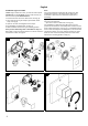 English Prevention of frost damage It is recommended that the "pressure balancing cartridge" be removed from the valve body if the system is to be shut off during the winter. Maintenance Important note: If the control unit is to be removed from the rough-in for servicing, first close the inlet stops then open the flow control to allow any internal pressure to be released from within the unit. 10 11 5 Inspect and clean all parts, replace if necessary and grease with special valve grease.