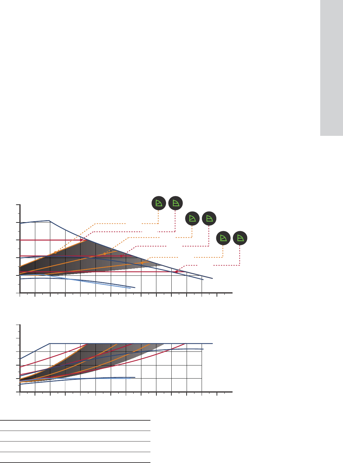 • Die Kennlinien für die Drehzahlstufen I, II und III sind im