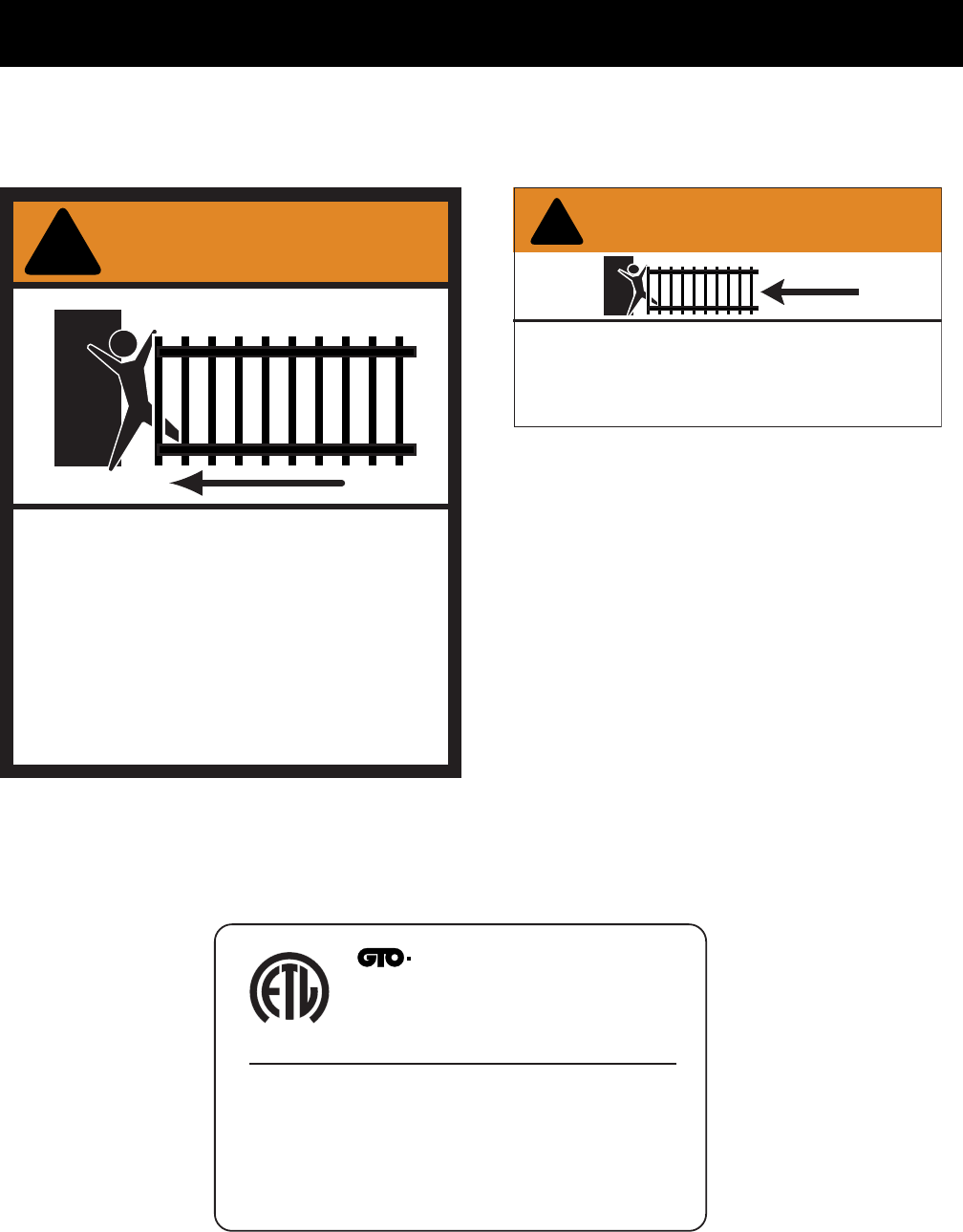 These warning labels should be found at the locations specified below. If any of them are missing, immediately contact GTO