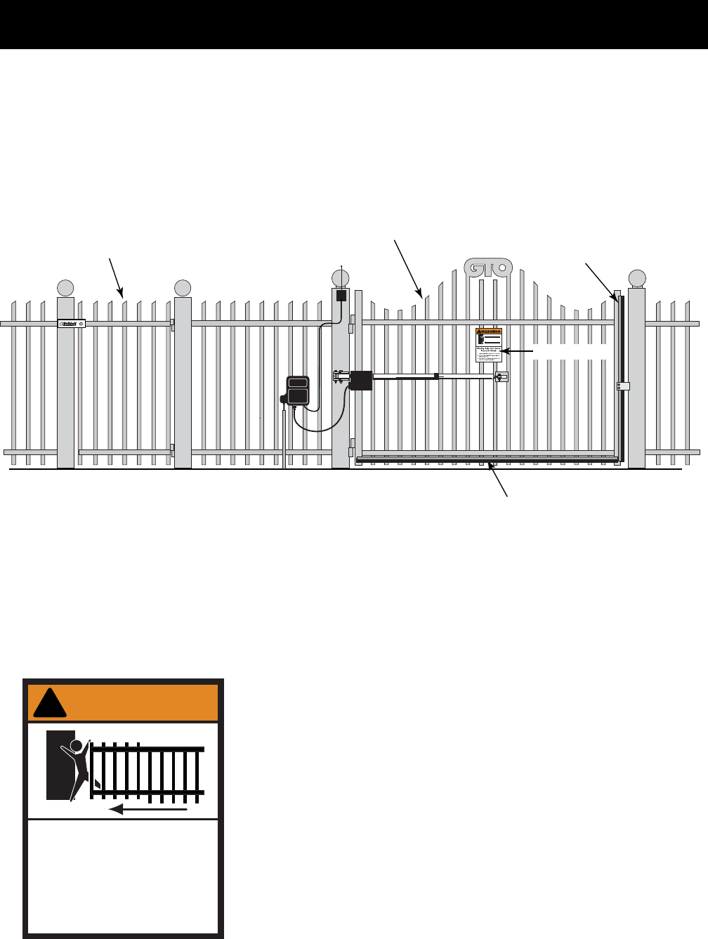 Warning signs alert people of automatic gate operation and are required when installing the GTO/PRO 2000 series gate