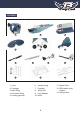 ASSEMBLY OF HORIZONTAL TAIL, VERTICAL TAIL & TAIL WHEEL: 1 2 Install the control horn to the elevator using the 1.7X15mm screws provided. 3 Install the control horn to the rudder using the 1.7x15mm screws provided. Install the rudder plate into the vertical tail. 4 Install the horizontal tail onto the fuselage with screw the 2 off M3x30mm screws provided. 5 Install the vertical tail using the M3x45mm and the M3x40mm screw provided. 7 6 Assemble the tailwheel parts using a medium CA glue.