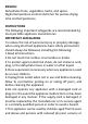 Onderhoud en Schoonmaken 1. Verwijder de stekker uit het stopcontact voor het schoonmaken. 2. Was de dehydrator lades en behuizing met warm water en een mild schoonmaakmiddel of was het in een afwasmachine. Indien noodzakelijk, kan een zachte borstel worden gebruikt om gedroogde voedselresten te verwijderen. Gebruik geen staalwol of bijtende schoonmaakmiddelen op onderdelen van de dehydrator. 3. Maak de basis van de dehydrator schoon met een zachte, vochtige doek.