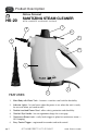 Product Description Deluxe Personal HS-20 Sanitizing Steam Cleaner With Complete Accessory Package 7 8 6 5 9 4 1 3 Features: 2 1. Main Body with Water Tank - features a stainless steel tank for durability. 2. Indicator Lights - let you know when the power is on, when the unit is ready for use and when you need to refill. 3. Double-insulated Power Cord - offers safety, protection and durability. 4. Comfort Grip Handle - has an ergonomic design for a sure grip. 5.