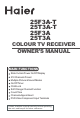 25F3A-T 25T3A-T 25F3A 25T3A COLOUR TV RECEIVER OWNER'S MANUAL MAIN FUNCTIONS Slide Curtain Power On/Off Display 218 Channels Preset Multiple Picture & Sound Modes On/Off Timer Child Lock Soft Change Channel Function Count Time Channels Appointment DVD Video Component Input Terminals Please read this manual carefully before operating the unit, and keep it for future reference.