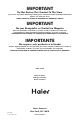 IMPORTANT Do Not Return This Product To The Store If you have a problem with this product, please contact the "Haier Customer Satisfaction Center" at 1-877-337-3639. DATED PROOF OF PURCHASE REQUIRED FOR WARRANTY SERVICE IMPORTANT Ne pas Réexpédier ce Produit au Magasin Pour tout problème concernant ce produit, veuillez contacter le service des consommateurs ‘Haier Customer Satisfaction Center’ au 1-877-337-3639. UNE PREUVE D’ACHAT DATEE EST REQUISE POUR BENEFICIER DE LA GARANTIE.