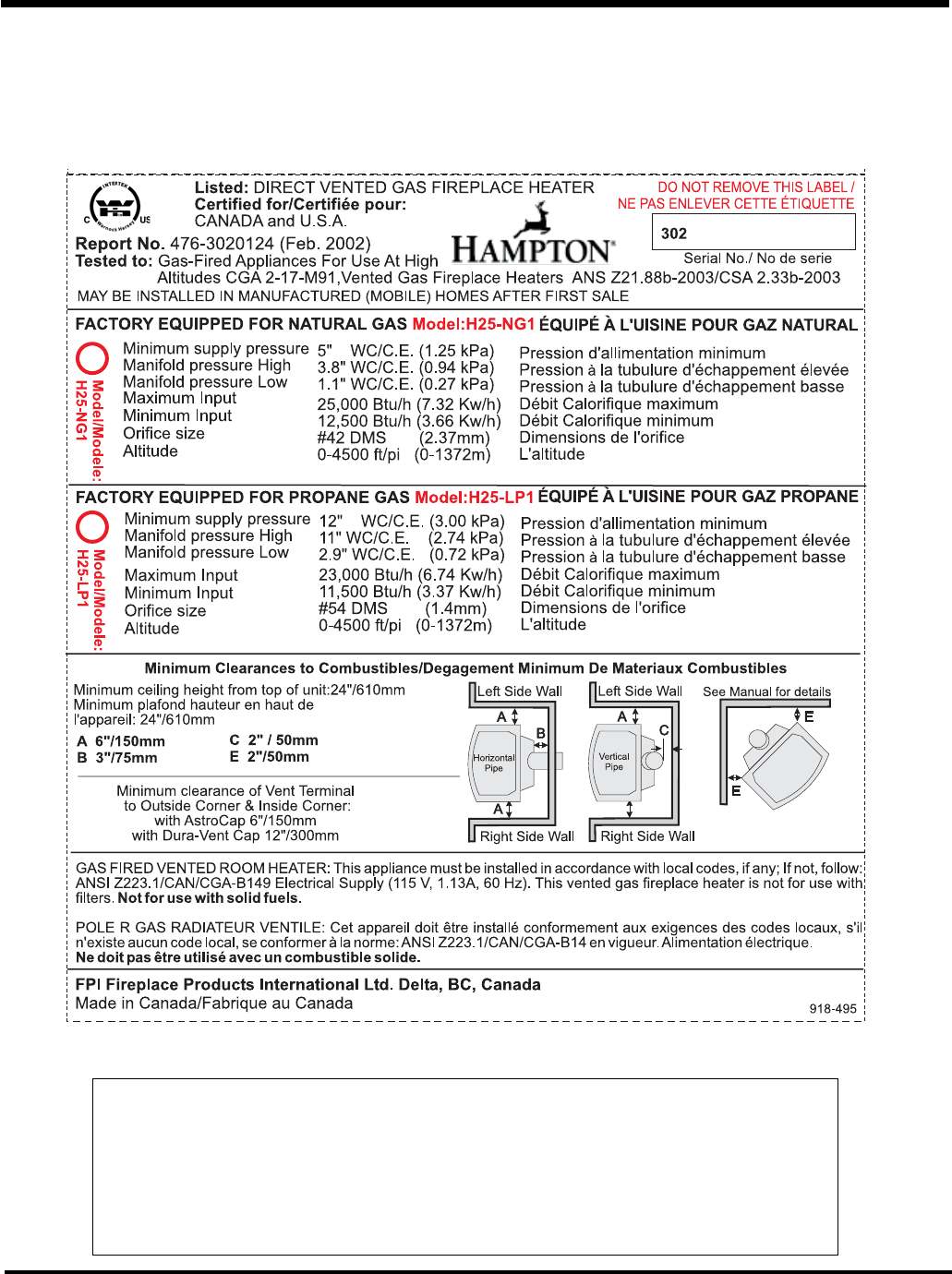 - HAMPTON Owners & Installation Manual H25 Direct Vent Gas Fireplace H25-NG1 Natural Gas, H25-LP1 Propane