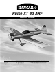 5. Pulse XT 40 ARF Assembly manual Specifications Wingspan.................................. 60.7 in (1540.5mm) Wing Area............................... 667 sq in (43 sq dm) Length............................................. 50 in (1270mm) Weight................. Glow: 5.5–6.25 lb (2.5 kg–2.8 kg) ..... Electric w/o battery: 4.7–5lb (2.1–2.