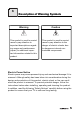 3 Description of Warning Symbols Warning Caution This symbol is used to remind users to pay attention to important descriptions regarding usage and maintenance (repair) or additional important information related to this product. This symbol is used to remind users to pay attention to the danger of electric shocks due to dangerous internal noninsulated components. Electric Power Notice Electric power may cause personal injury and mechanical damage if it is misused.