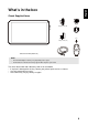 English What’s in the box OP EN K OC Check Supplied Items L OP EN CK Adapter head (UK) LO Clip Adapter head (EU) Tablet PC SN1AT76(HSG1316) NOTE: • The included adapter head may vary depending on the region. • The illustrations in this document may appear differently from your model. This Quick Start Guide and a Warranty card are also included. • If any item is damaged or missing, contact your point of purchase for assistance. • Use only approved accessories.