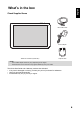 English What’s in the box Check Supplied Items Micro USB cable Power adapter Tablet PC SN1AW72 (HSG1297) Adapter head NOTE: • The included adapter head may vary depending on the region. • The illustrations in this document may appear differently from your model. This Quick Start Guide and a Warranty card are also included. • If any item is damaged or missing, contact your point of purchase for assistance. • Use only approved accessories. • Accessories may vary by country or region.