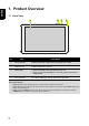 English 1. Product Overview 1.1 Front View 1 No. Item 2 3 4 Description 1 Touch Screen Displays the user interface and receives touch input. 2 Volume Keys Press to adjust the volume. 3 Power Key • Press and hold to turn the device on or off. • Press to turn the backlight on / off and put the device into sleep mode. 4 Front Camera For video chatting or taking self-portrait pictures.