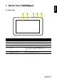 English 1. Know Your HANNSpad 1.1 Front View 1 No Item 2 3 4 5 Description 1 Touch Screen Displays the user interface and receives touch input. 2 Camera For video chatting or taking self-portrait pictures. 3 Volume Keys Press to adjust the volume. 4 Power Key • Press and hold to turn the HANNSpad on or off. • Press to turn the backlight on / off and put the device into sleep mode. 5 Charging Status Indicator Lights red while charging the battery.