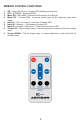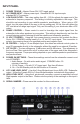 REMOTE CONTROL FUNCTIONS 1. 2. 3. 4. 5. 6. 7. 8. 9. ON – Power ON. Blue or Fuchsia LED indicating volume level. OFF – STANDBY. Single Red LED. Music EQ – Blue LEDs. Extended low frequency at 0 dB level. Movie EQ – Fuchsia LEDs. Increases system gain +6 dB, enhances upper bass range. Input #1 – LFE / Line Level – One flash of bottom LED. Input #2 – Wireless – Two flashes of bottom LED. Input #3 – Speaker / High Level – Three flashes of bottom LED.