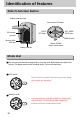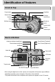- Identification of features Front & Top Power button Viewfinder Shutter button Flash light amount sensor Speaker Flash Microphone Self-timer lamp USB/ AV connection terminal DC input connection point Lens Back & Bottom Autofocus indicator lamp(Green) Flash indicator lamp(Red) Zoom W button (Thumbnail) Zoom T button (Digital zoom) Viewfinder Mode dial Strap eyelet LCD button LCD monitor 5-function button Tripod socket +&-/ DELETE button Play mode button * When using the digital zoom to take a