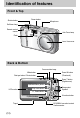 - Identification of features Front & Top Power button Shutter button Microphone Self-timer lamp Remote control sensor Auto Focus lamp Flash Lens / Lens cover Back & Bottom Camera status lamp Wide button Red-eye button / Printer button Zoom W button (Thumbnail) Zoom T button (Digital zoom) M(Mode/Album) button LCD monitor Play mode button Strap eyelet Speaker +/-, Delete button E (Effect) button Tripod ŝ10Ş 5 function button DC/USB/AV connection terminal Cradle connector