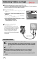 Selecting Video out type The Movie output signal from the camera can be NTSC or PAL. Your choice of output will be governed by the type of device (monitor or TV, etc.) to which the camera is connected. PAL mode can support only BDGHI. Setting the Video Out Type 1. In any mode other than Voice Recording mode, press the MENU button. 2. Press the LEFT/ RIGHT button and select the [SETUP] menu tab. 3. Select the [VIDEO] menu by pressing the UP/ DOWN button and press the RIGHT button. 4.