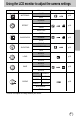 Setting up the play back function using the LCD monitor Menu tab Main menu D P O F CANCEL SELECT Sub menu Secondary menu STANDARD - INDEX - SIZE - ONE PIC - ALL PICs - DEFAULT - Page p. 70 p. 72 AUTO PAPER SIZE POSTCARD, 4X6, L 2L, A4, A3 AUTO LAYOUT FULL INDEX 1, 2, 4, 9, 16 P C I U AUTO C S PLAIN T PAPER TYPE PRINTER T SETUP O FASTPHO. AUTO B M R I I Z D E PRINT QUALITY PHOTO p.