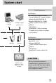 System chart System Requirements For Windows Computer (see p.107) PictBridge compatible printer(see p.71) PC with processor better than MMX Pentium 233MHz (XP : Pentium II 300MHz) Windows 98/ 98SE/ 2000/ ME/ XP Minimum 32MB RAM (XP : 128MB) 140MB of available hard-disk space USB port CD-ROM drive 800x600 pixels, 16-bit colour display compatible monitor (24-bit colour display recommended) For Macintosh Power Mac G3 or later Mac OS 9.0 ~ 10.