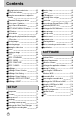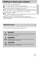 Contents READY Getting to know your camera About the icons Danger Warning Caution An FCC warning System chart Identification of features Front & Top Back & Bottom Side/ 5-function button Mode dial Connecting to a Power Source Using the batteries Removing the battery Using the AC power adapter (SAC-51, 5.