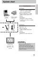 System chart System Requirements For Windows Computer (see p.107) PictBridge compatible printer(see p.71) PC with processor better than MMX Pentium 233MHz (XP : Pentium II 300MHz) Windows 98/98SE/2000/ME/XP Minimum 32MB RAM (XP : 128MB) 140MB of available hard-disk space USB port CD-ROM drive 800x600 pixels, 16-bit colour display compatible monitor (24-bit colour display recommended) For Macintosh USB cable AV cable Power Mac G3 or later Mac OS 9.0 ~ 10.