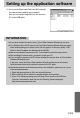 Setting up the application software To use this camera with a PC, install the application software first. After this has been done, the stored images in the camera can be moved to the PC and can be edited by an image editing program. INFORMATION ● Close other programs before installing the application software. ● Before installing the application software, disconnect the USB connection. You can visit the Samsung web-site through the internet. http://www.samsungcamera.com : English http://www.