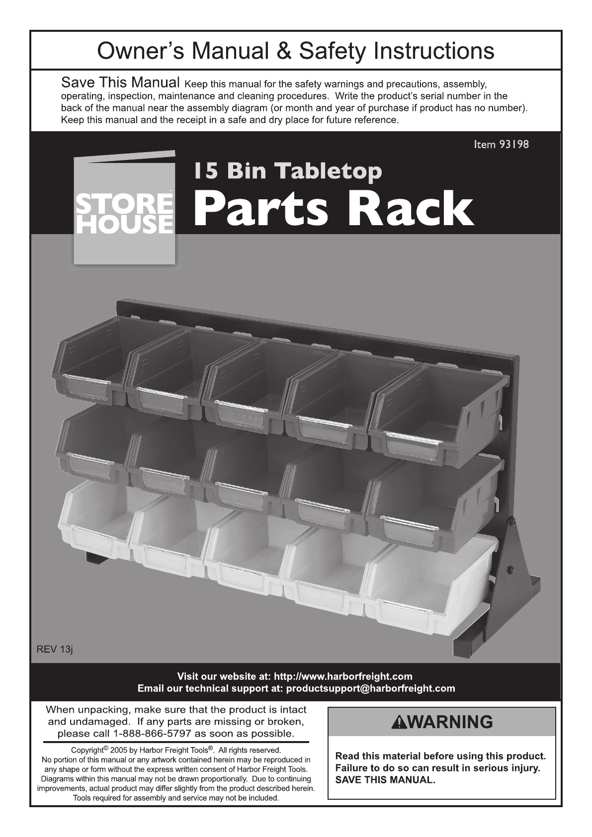 Specifications Materials Molded Polyethylene Plastic Bin Interior Dimensions 5" D x 3.5" W Weight Capacity 5 lb per Bin, 75 lb total for rack IMPORTANT SAFETY INFORMATION Assembly Precautions 1. Assemble only according to these instructions. Improper assembly can create hazards. 2. Wear ANSI-approved safety goggles and heavy-duty work gloves during assembly. 3. Keep assembly area clean and well lit. 4. Keep bystanders out of the area during assembly. 5.