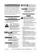 7. Make sure the extension cord is properly wired and in good electrical condition. Always replace a damaged extension cord or have it repaired by a qualified electrician before using it. 8. Protect the extension cords from sharp objects, excessive heat, and damp or wet areas. RECOMMENDED MINIMUM WIRE GAUGE FOR EXTENSION CORDS* (120/240 VOLT) (at full load) 50’ 75’ 100’ 150’ EXTENSION CORD LENGTH 25’ NAMEPLATE AMPERES 0 – 2.0 18 18 18 18 16 2.1 – 3.4 18 18 18 16 14 3.5 – 5.